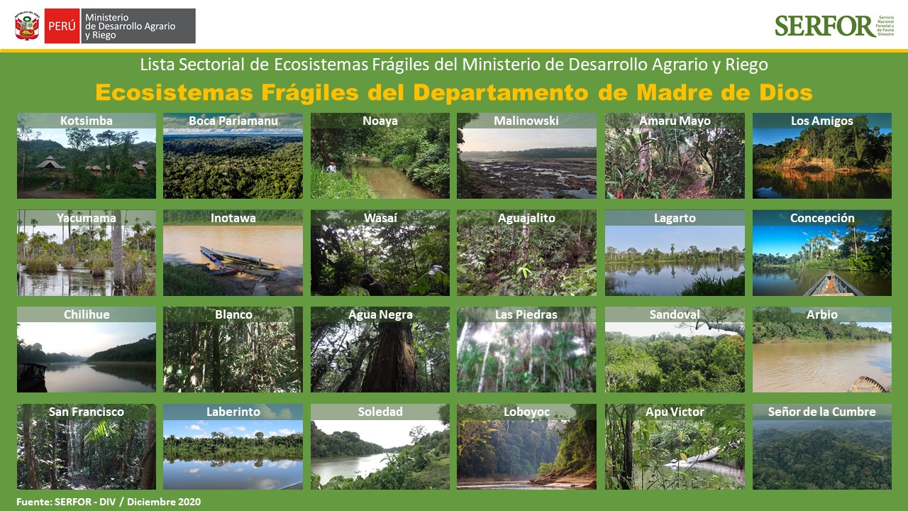 Los ecosistemas frágiles son áreas de alto valor de conservación, con una gran riqueza en especies de flora y fauna silvestre, donde se encuentran especies amenazadas y endémicas, y se hallan hábitats en buen estado de conservación que brindan servicios ecosistémicos en beneficio de la población local.