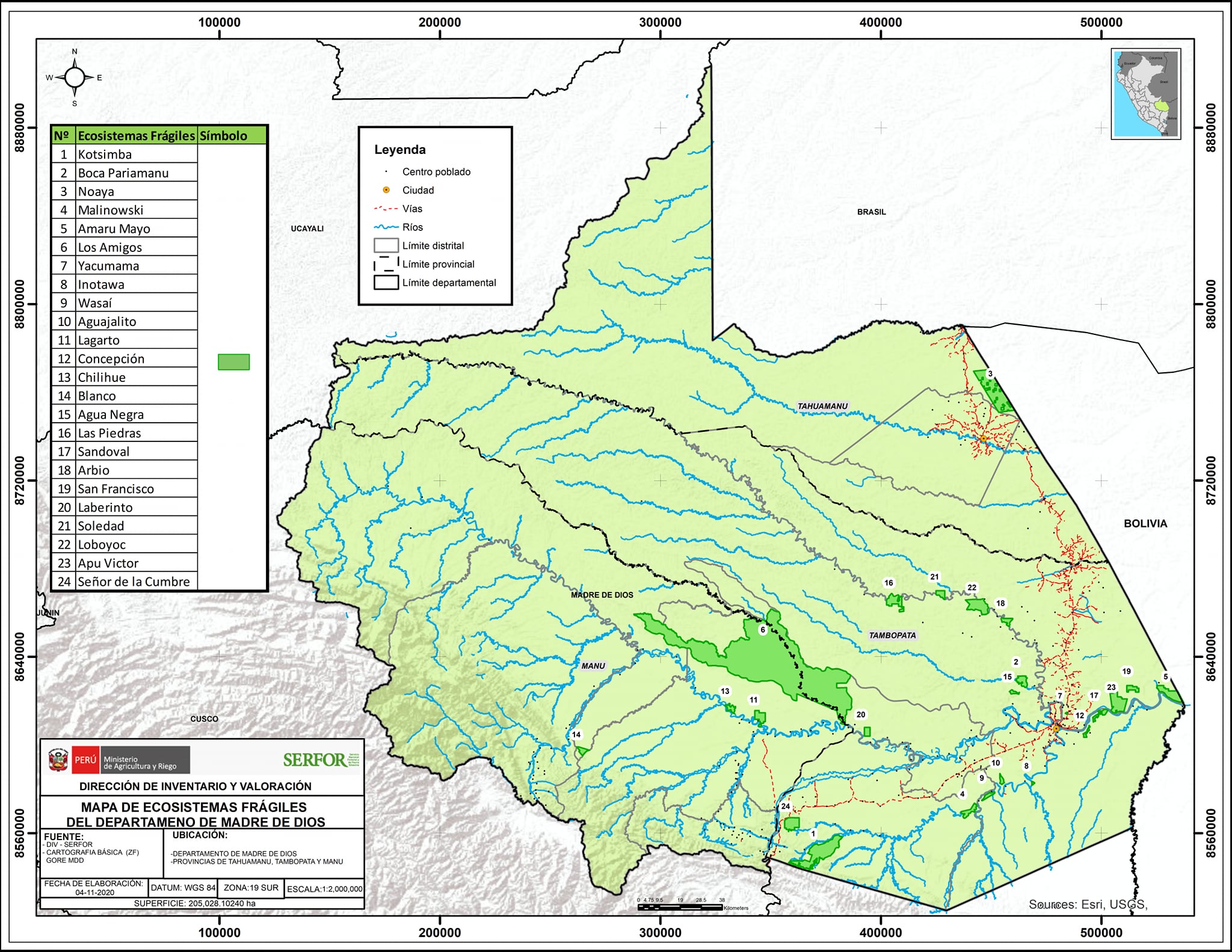 En coordinación con las autoridades regionales, locales y comunidades campesinas, comunidades nativas, titulares de concesiones de conservación, concesiones de ecoturismo y población local, el Servicio Nacional Forestal y de Fauna Silvestre (SERFOR) del Ministerio de Desarrollo Agrario y Riego incluyó 24 Ecosistemas Frágiles a la Lista Sectorial de Ecosistemas Frágiles de Madre de Dios, con una extensión de 205,028 hectáreas, entre ellos el bosque de ARBIO en la cuenca del río Las Piedras, provincia de Tambopata.