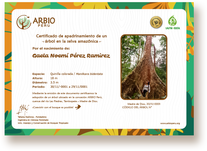 ArbioPeru nace para hacer posible la protección de estas 916 hectáreas.  Para sustentar financieramente estas actividades creamos en el año 2012 un Sistema de Protección de Hectáreas online que permite a cualquier persona ser un Defensor del Bosque apadrinando una hectárea por US$100 anuales.  El sistema permite seleccionar en el mapa el lote que se desea proteger, se genera un certificado a nombre del cliente y si se desea comprar para regalo, el sistema permite ingresar el nombre y correo electrónico de la persona a quien le llegará el certificado a su nombre.